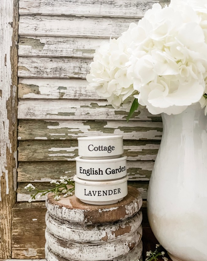 Antique English Ironstone Riser stack of 2 w/ Cottage, English Garden, Lavender transfers - transfers/wording has been permanently fired onto these pieces.