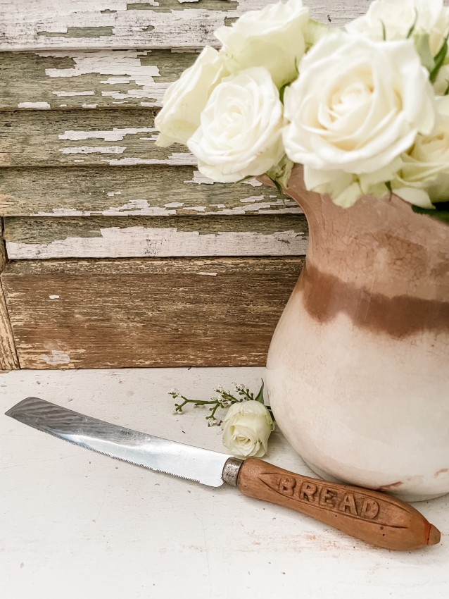 Antique Bread Knife Carved, wood - Patina- Bread carved on handle - Stamped Shefield England