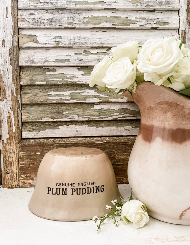 Antique Ironstone Pudding Mold w/ Genuine English Plum Pudding transfer, staining throughout