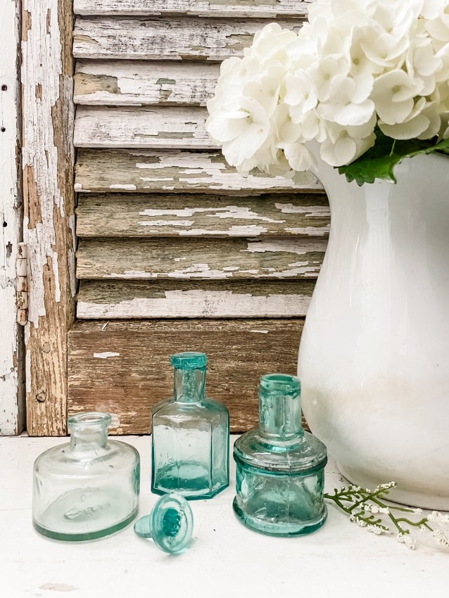 Antique, English. SET OF 3 Antique/Vintage Aqua ink wells w/ Glass Toppers. Shades of blue/aqua and are in great antique condition.