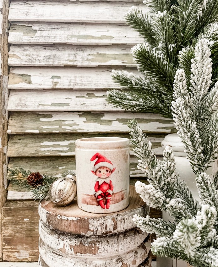 Antique Ironstone Crock w/ Elf transfer - Holiday