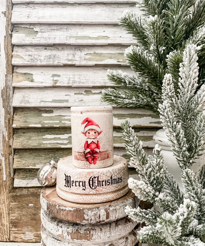 Antique Ironstone Set - Merry Christmas Lift & Crock w/ Elf transfer - Holiday